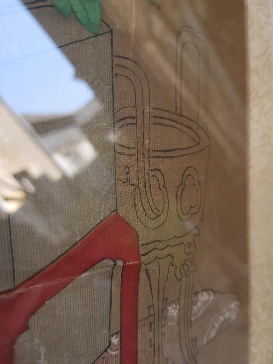Chinese or vietnamese painting consisting of a painting on canvas depicting antiques and objects of scholarship on an entablature, censers, vases topped with flowers and Chinese musical instrument that must be a zither. average state, to re-frame. dimensions of the painting without the sidebands: 53 cm x 38,5 cm I prefer to send it to you without the window by colissimo.
