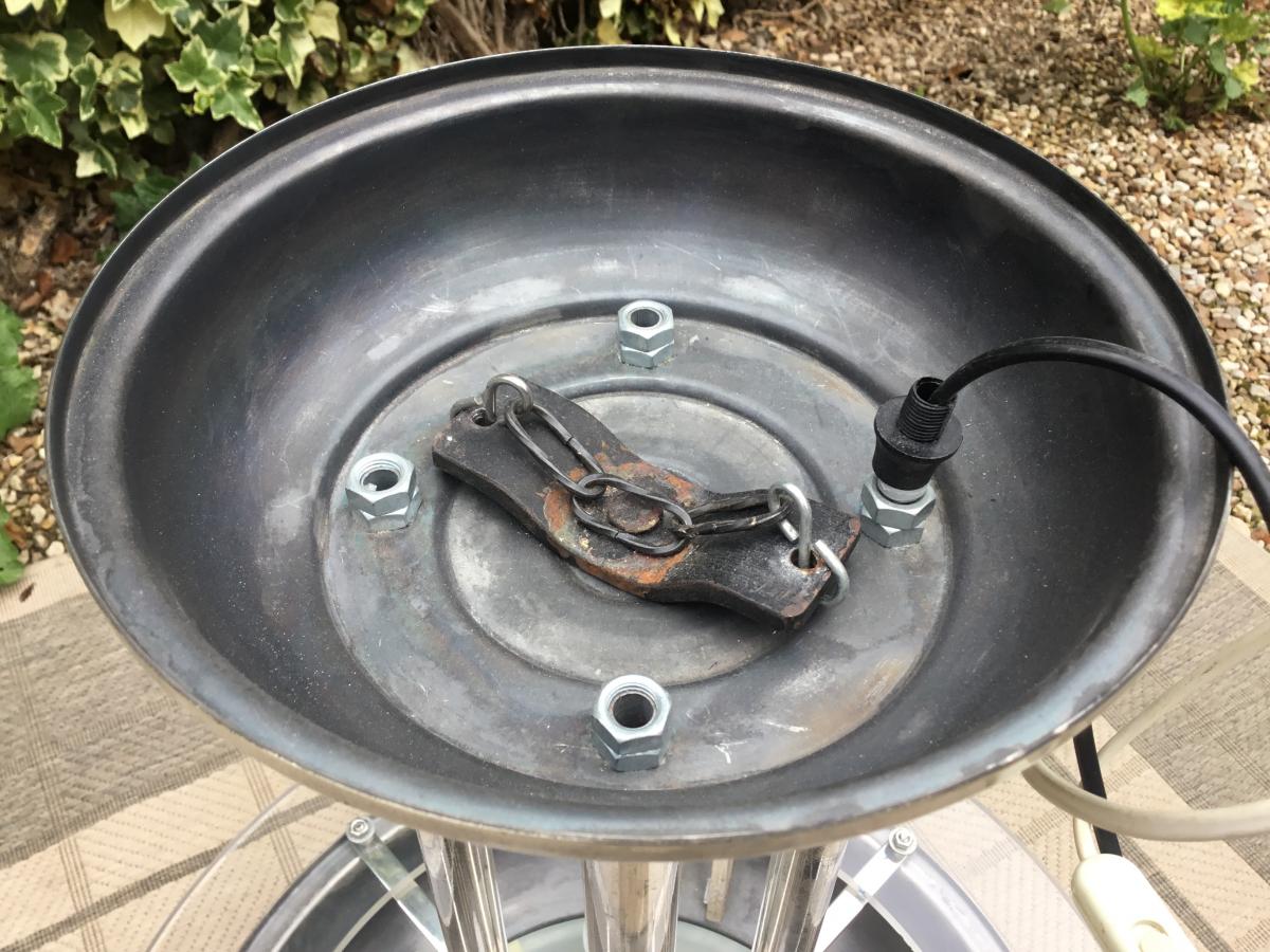 Very rare pair of Art Deco chandeliers. They are from the early 70's. They come from a hotel in Barcelona and were there two months ago. The silver metal has a very beautiful patina. The transparent parts are in Altuglass. The underside is frosted glass. They can extend 25 cm in height. At the shortest, they are 73 in height. They are electrified nine. A pair hardly found today.