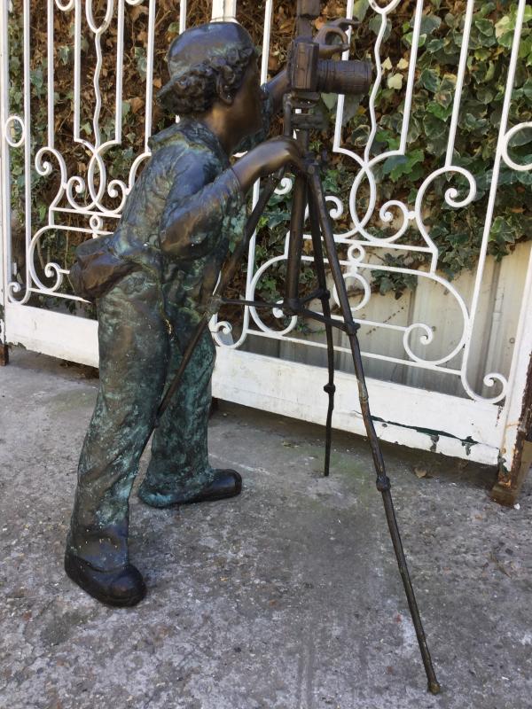 Important brown patina bronze event of the 1980s, representing a young photographer. The work is signed Palelo Bomlano The whole is in good condition, some traces of gray green in places. Beautiful decoration, suitable for indoor and outdoor. Max Height: 1,15m Max Depth: 78cm Max Width: 73cm Transport possible in France and worldwide on request
