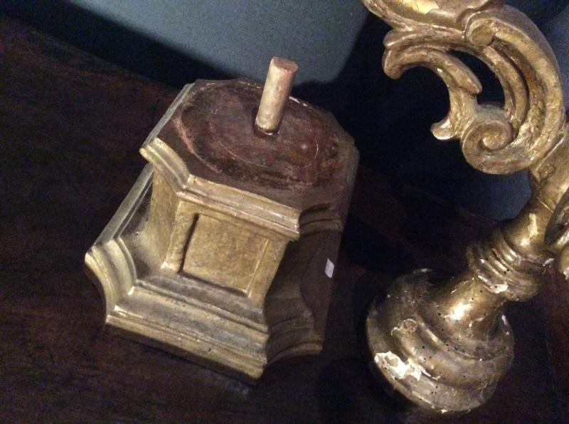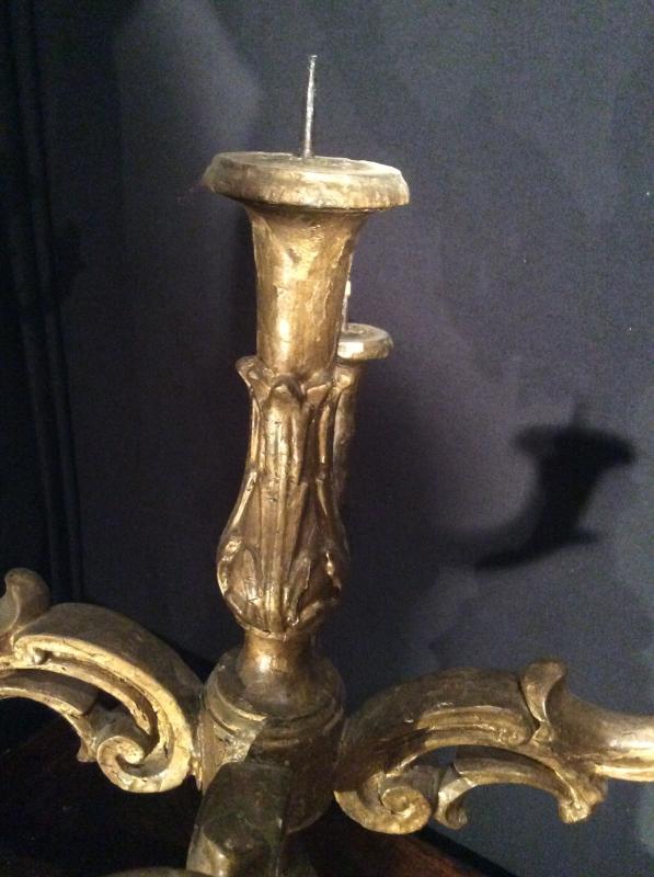 A pair of gilded wood candelabra with five arms of light. The candelabra rest on a pedestal probably later period. It is square (21X21) curved in the corners and largely molded. A frame is carved on all four sides. Along a vertical axis, hang four arms of light carved scrolls and acanthus leaves ending in a wrought iron spike. The base is round and molded. Some lacks on the gilding (see photo), a layer of bronzine covers practically all the gilding. Spectacular decorative element.