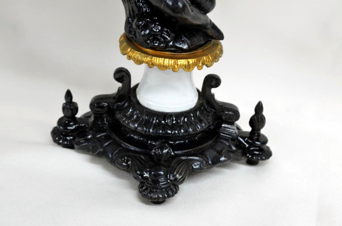 Elegant pair of lamps symbolizing the romantic period of the 19th century, in black and gold cast iron, white porcelain rings. These lamps can be transformed into candlesticks by simply removing the lampshade / electrification part of a room (see the last of the eleven photos). Two sheets on one lamp and one sheet on the other lamp are missing. The water green and burgundy lampshades are made of handmade Nepalese paper. New electrification and lampshade. Total height of the lamps 55 cm. Feet height 35 cm.