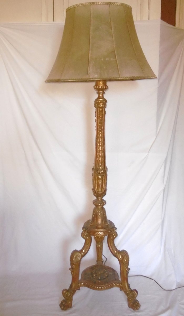 Beautiful old torchiere in carved and gilded wood transformed into a lamppost, three legs with lion's paws connected by a spacer, skin shade, electrified.
