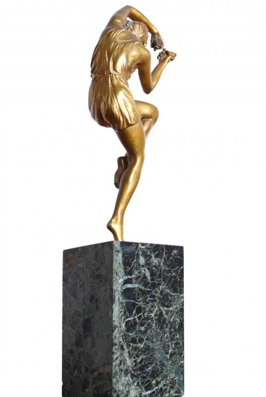 Sculpture by Pierre Le Faguays (1892-1962) in gilded bronze, presenting an Art Deco dancer dressed in a tunic and holding two bunches of grapes in her hands. Green veined marble terrace inlaid with an incised bronze cartouche and engraved with stylized Art Deco motifs, stamp of the founder LN Paris JL and numbered 21 under the foot, Les Neveux de J. Lehmann, abbreviated LN Paris JL is a foundry of Parisian art, which acquired is reputation by the production of bronze sculptures and chryselephantine, in the Art Deco period between 1920s and 1930s. Incised signature "Laurel", Pierre Laurel being one of the pseudonyms of Pierre Le Faguays .