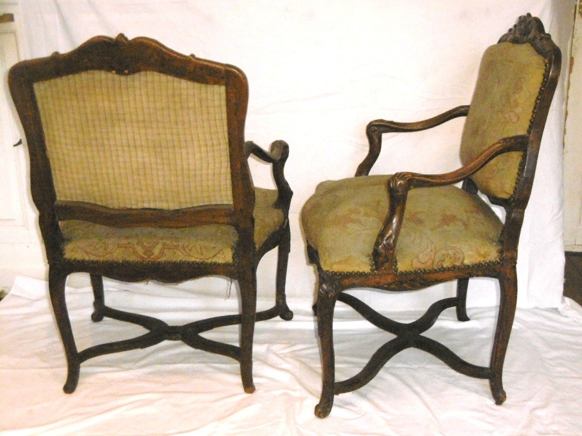Elegant pair of early 18th century armchairs in richly carved natural wood decorated with flowers and foliage, crosses in X, furnished with an 18th century tapestry (worn in places) to be cleaned, a moving armrest, used condition.