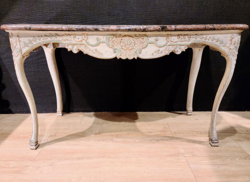 Lovely console table called "game" dating from the Regency period, 18th century. This console table is in white lacquered wood, green rechampi with gilding. It has a carved decoration of flowers, and a shell in a central cartouche at the bottom of braces. It rests on four high curved legs, its top is a marble top. This piece is in good condition, to note the natural wear of time, not removing anything from its charm. Dimensions: 131cm wide, 68cm deep, 75cm high.
