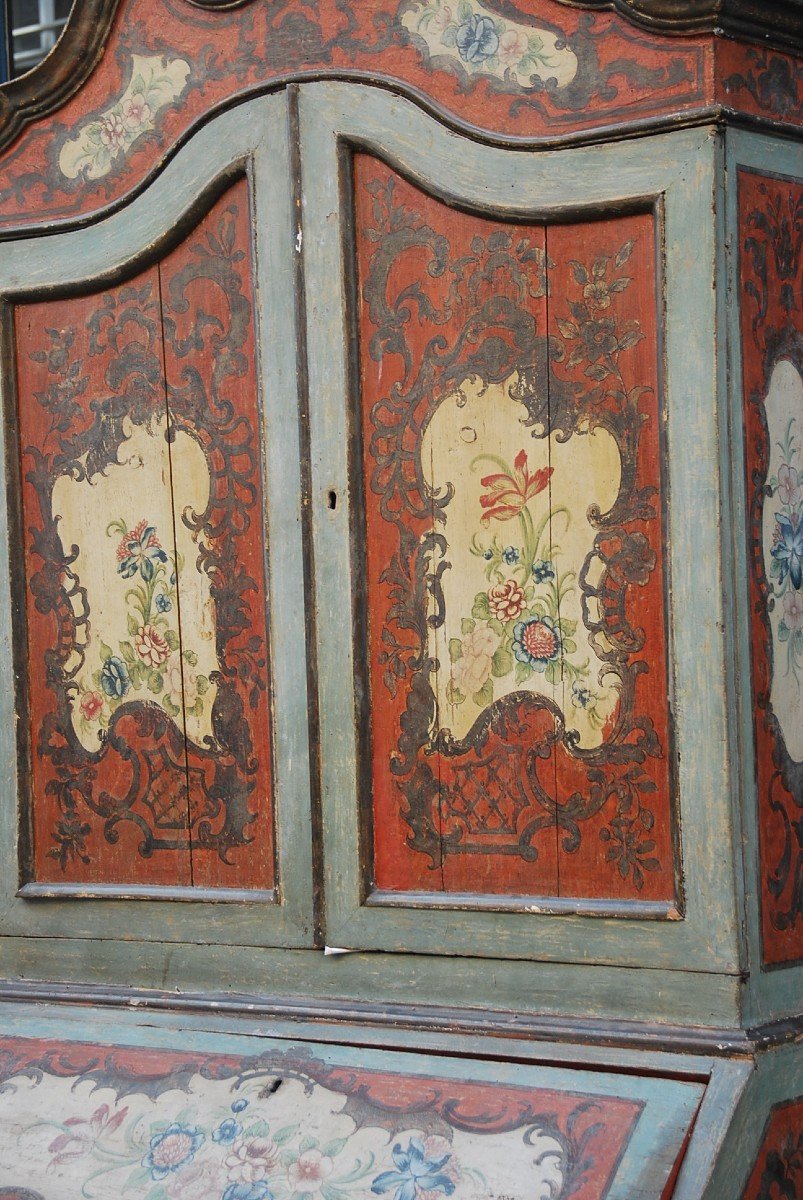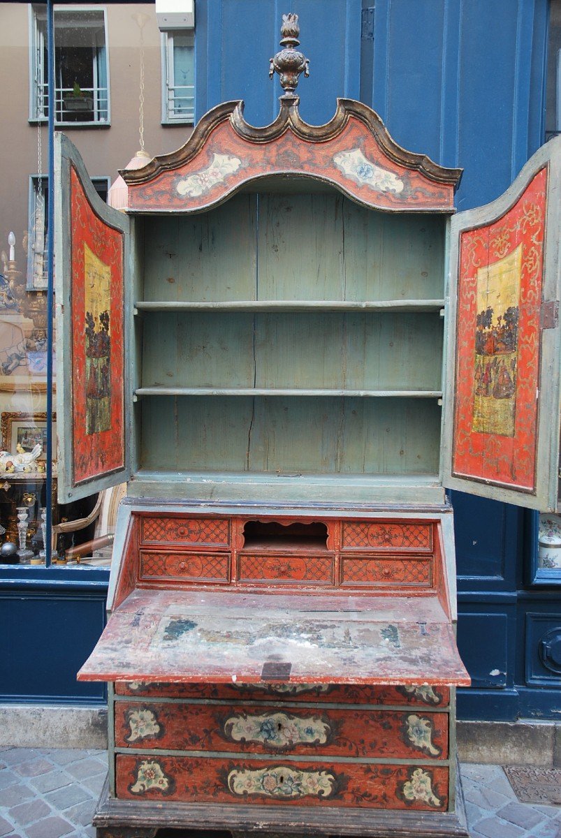 Rare and important scriban in painted and polychrome wood with scenes by Arte Povera, this is a Venetian work from the mid-18th century. Convenient in the lower part and opening with three rows in three rows, a flap revealing a set of 5 small drawers and a niche, the upper part opening with two leaves surmounted by an openwork pediment topped by a vase carved with mecca leaf This "beautiful" and rare piece of furniture painted with a celadon green and coral background is decorated on the outside with bouquets of polychrome flowers in rock gardens, the interior of scenes known as Arte Povera, the moldings partly painted with meca (silver leaf), it is mounted on coniferous wood and or poplar, presented in its old "juice" with some accidents and lacks, nevertheless rare furniture and elegant proportions, extremely decorative Venetian work from the mid-18th century