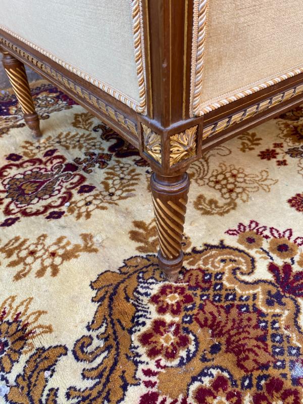 Very beautiful Directoire style daybed in walnut enhanced with finely carved gilding and covered with fabrics with tapestry band, all in excellent condition
