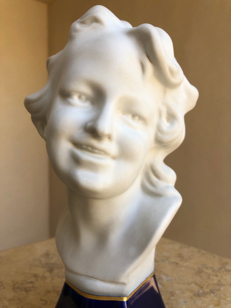 Rare bust of a young smiling woman in porcelain biscuit, Limoges, France. Biscuit porcelain prints on porcelain pedestals with a blue background and gold fillets. Mid-twentieth century. height 25.5 cm