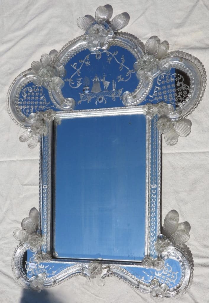 Mirror with engraved decoration with figures and planter adorned with flowers and leaves in petals perfect condition Width: 64 cm Height: 95 cm Depth: 7 cm