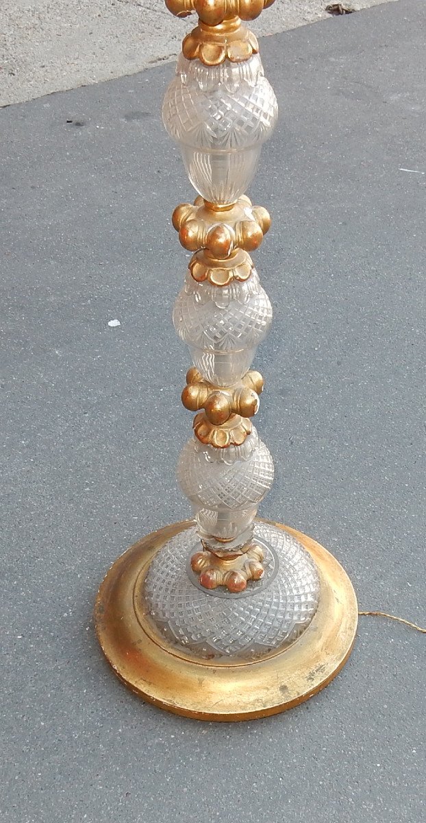Floor lamp composed of elements in gilded wood and crystal, 3 bulbs. Height of the barrel without the basin 163 cm. Condition of use. Circa 1950 Height: 188 cm Diameter: 40 cm