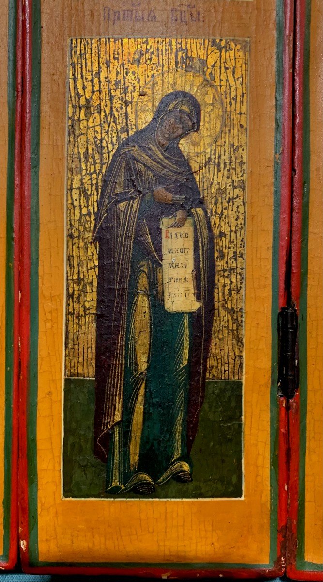 The iconostasis (from Greek, eikon, image and stasis, station) is the most important non-architectural ensemble of an Orthodox church. It is made up of several rows of icons arranged according to the liturgical order. Physically and spiritually, the iconostasis divides the church into two parts: the nave and the altar. The portable iconostasis was mainly reserved for armies in the field, as a support for prayer, especially before major battles. This one is exceptionally complete.