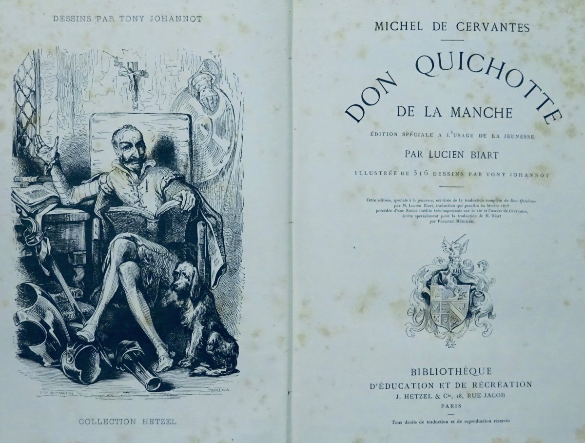 CERVANTES SAAVEDRA (Miguel de) - The ingenious Hidalgo Don Quixote de la Mancha. Paris, Hetzel & Cie, 1877; in-4, VIII-543 pp., publisher's binding full red calico printed with black and gold, smooth spine, covers printed with armor surrounded by a donkey and a horse. Special edition for the use of young people by Lucien Biart. Illustrated with 316 drawings by Tony Johannot.