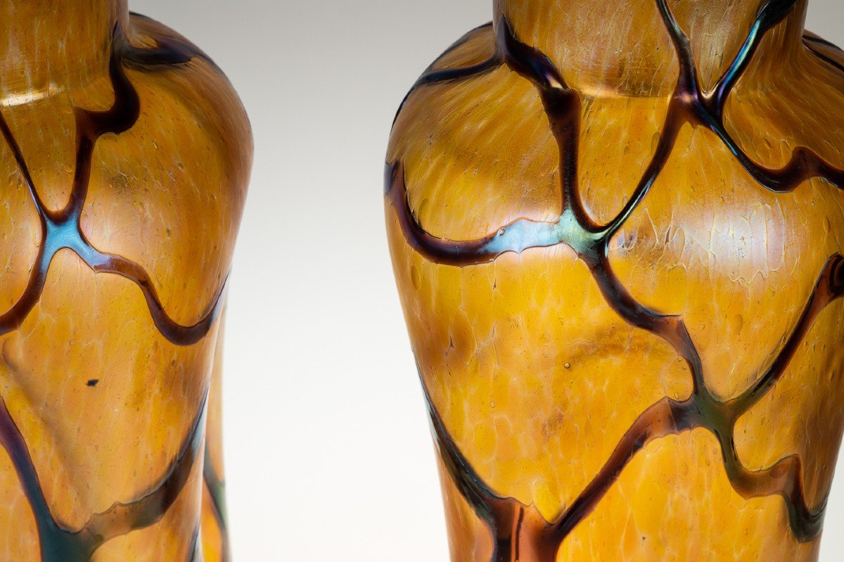 A pair of magnificent "Pampas" vases in iridescent glass. The vases are decorated with multicolored ribbons which, on the one hand, resemble floral motifs and, on the other hand, border on abstraction. They come from the famous Czech art glass factory Wilhelm Kralik Sohne. The company founded by Wilhelm Kralik (1806-1877) at the time of his death included at least seven glassworks, some of which were taken over by his four sons. They continued to perfect modern glassmaking techniques and produce top quality art glass. The company existed until around 1940. Wilhelm Kralik Sohne, Art Nouveau, Bohemian, around 1900. Height 36 cm. Very good state. Similar models of Kralik vases: http://www.kralik-glass.com/kralikpampasarray.html https://sites.google.com/site/loetzandglass/kralik-7--silverband Free shipping in EU. ! I send packages by insured courier (DPD or DHL). All items are packaged very carefully.