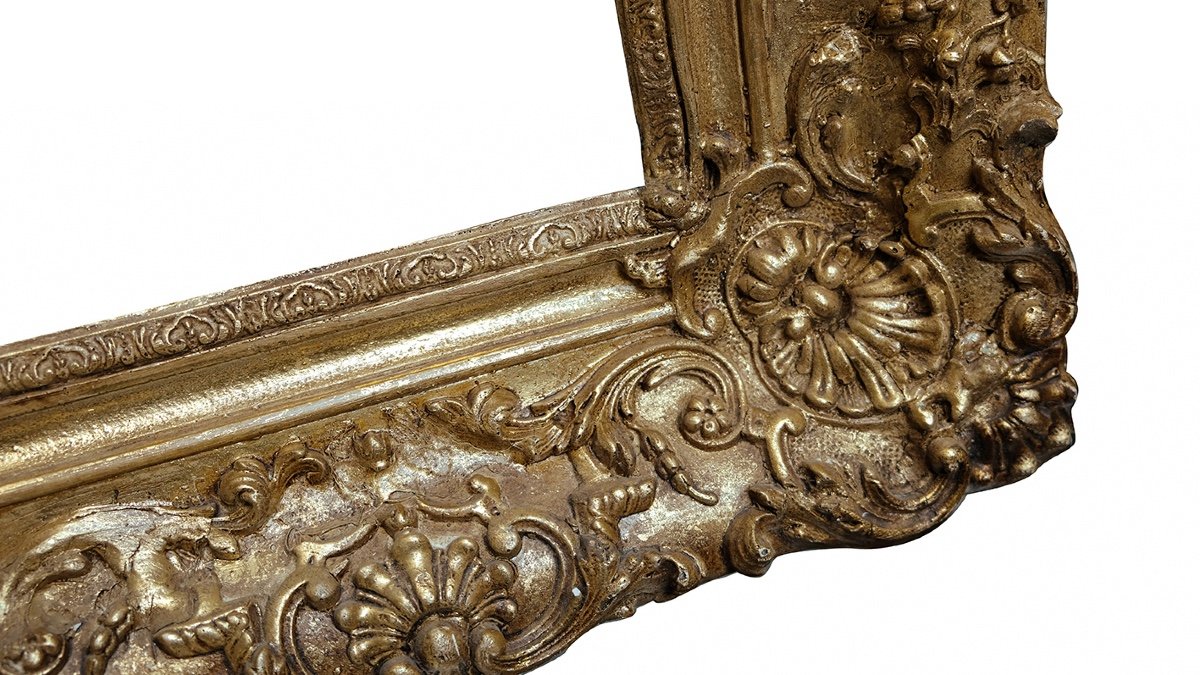 Louis XIV style gilt frame decorated with shells at the corners and medallions at the centers.
