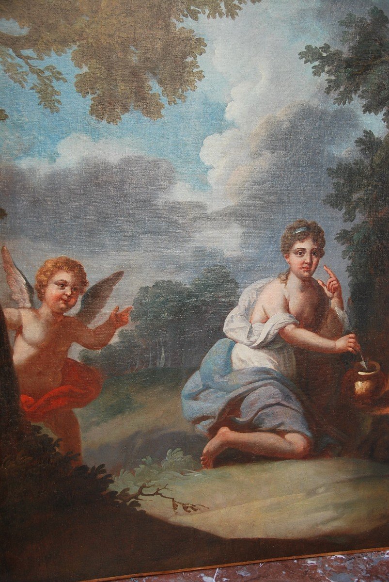 Oil on canvas (re-lined) representing a genre scene, a young woman draped in the Antique style holding an arrow, symbolizing Venus plunging an arrow into a pot with Cupid Work from the end of the 18th century, Louis XVI period Good condition, perhaps an old canvas woodwork and or trumeau, pretty shades of colors, charming subject