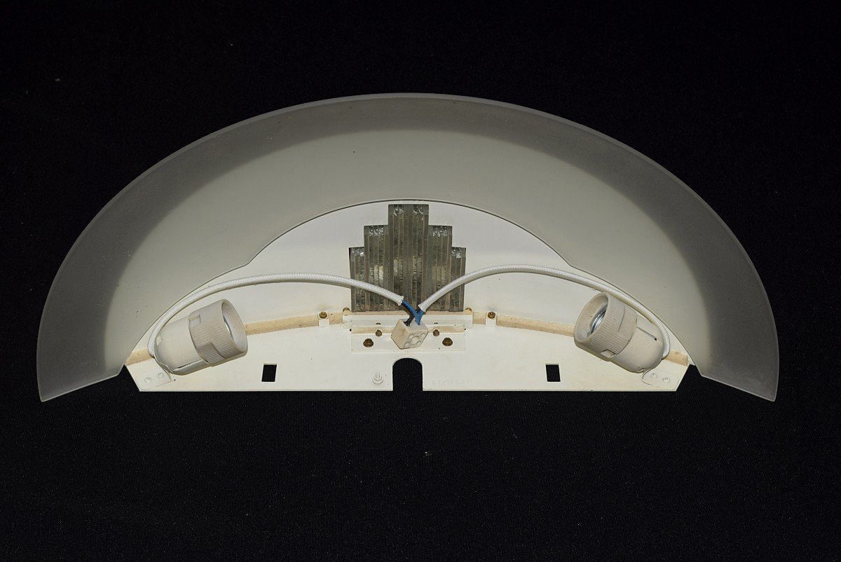The 542 bis model created in the 1930s by Jean Perzel, and still produced today, is one of the finest creations of the Art Deco period. Five stepped hand-cut diamond glass blades reflecting beautiful shimmering light, highlighted by a bronze mount, support a gilt bronze and sandblasted glass cup. The sandblasted glass part of the cup is removable as shown in the photos. Each of the wall lights is signed Perzel. This present pair of wall lamps dating from the 1980s is ready to be installed, two-light electrification in good working order. Width 44 cm, depth 27 cm, height 21 cm. Jean Perzel was born in Bruck, in Bavaria, on May 2, 1892. He learned the profession of glass painter at a very young age in Munich and at sixteen, the first to leave school, he undertook his tour of Europe on foot: Austria, Czechoslovakia, Switzerland, Upper Italy, then France. Along the way he gets hired in workshops to earn a living and learn the different techniques. He arrived in Paris in 1910 at the home of a master glassmaker who sent him after a year to carry out important work in Algiers. He returned to Paris in 1914. He joined the Foreign Legion, was demobilized in 1919 and naturalized French. He still works as a glass painter, mainly at Gruber. From 1923 he specialized in the study of modern interior lighting. He exhibited at the Salon d'Automne since 1924, at the Salon des Artistes décorateurs since 1925, at the National Society of Fine Arts from 1932 to 1936, and abroad: Barcelona, Bari, Brussels and New York. He is part of many juries during his exhibitions. He won first prize in the Lighting Competition organized at the Salon des Décorateurs in 1928 and four first prizes in the Luminaire Competition in 1936. He was responsible for organizing the lighting of the Palais de la SDN in Geneva, the cathedral of Luxembourg, from Mulhouse station, from the French Institute in London, executed works for the Maharaja of Indore, for the Court of Belgium, Henry Ford in Detroit, the buildings of the European Coal Community and the steel, the Canadian Embassy in The Hague, the residence of the Emperor of Annam in Dalat, the residence of the King of Siam in Bangkok, etc. Jean Perzel has been a Knight of the Legion of Honor since 1937.