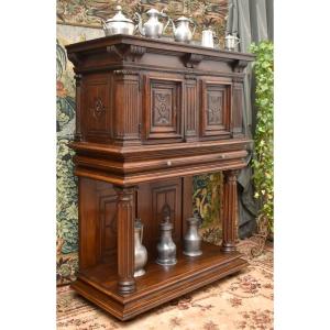 A Louis XIII period four-door buffet in solid walnut, circa 1680, opening with four doors and two drawers, with wide diamond-point moldings. The upper section is carved with garlands of flowers surmou[...]