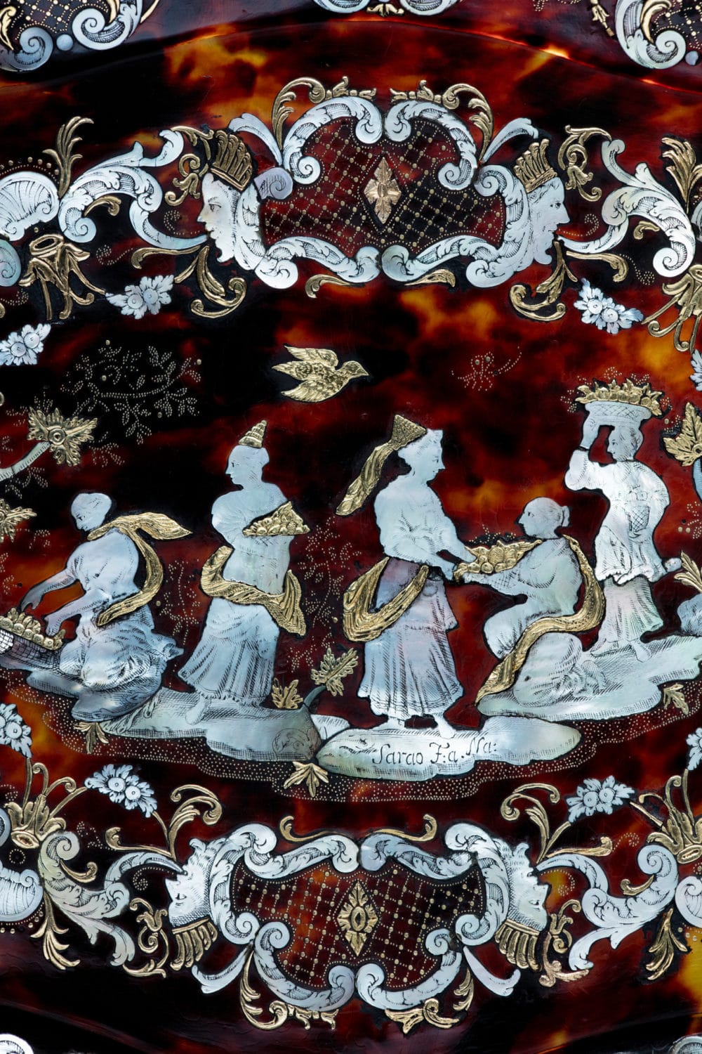 Les auteurs de ces merveilles étaient appelés ‘Tartarugari’. Le plus fameux d’entre eux fut Giuseppe Sarao, dont l’atelier s’adossait aux murs du palais royal et qui a signé certaines pièces présentées dans l’exposition.